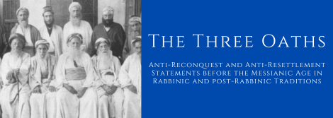 The following statements are centered around what is generally known as the Three Oaths, a set of cautioning Rabbinic declarations against the reconquest and mass-resettlement of the Holy Land before the messianic age, which were recorded in the Talmud and adjacent Rabbinic literature during the Amoraic age (200-500 CE). These Rabbinic declarations are considered by some as midrashím, that is non-legally-binding homiletical material. However, there is a specific type of midrash called midrash halakháh whose function is to elucidate Biblical sources for halakhic (legalistic) purposes, which I am not yet prepared to discuss. The following material is presented in chronological order, so the reader can appreciate the evolution of this Rabbinic stance across the centuries in post-Rabbinic pan-Sephardic tradition, which should help you note slight changes but also their consistency.